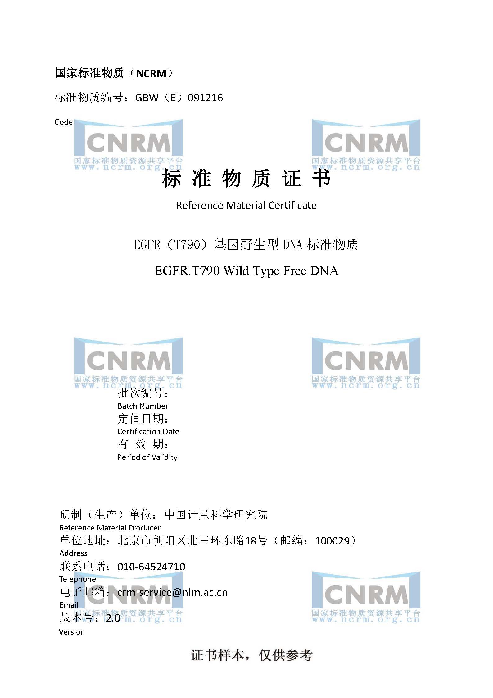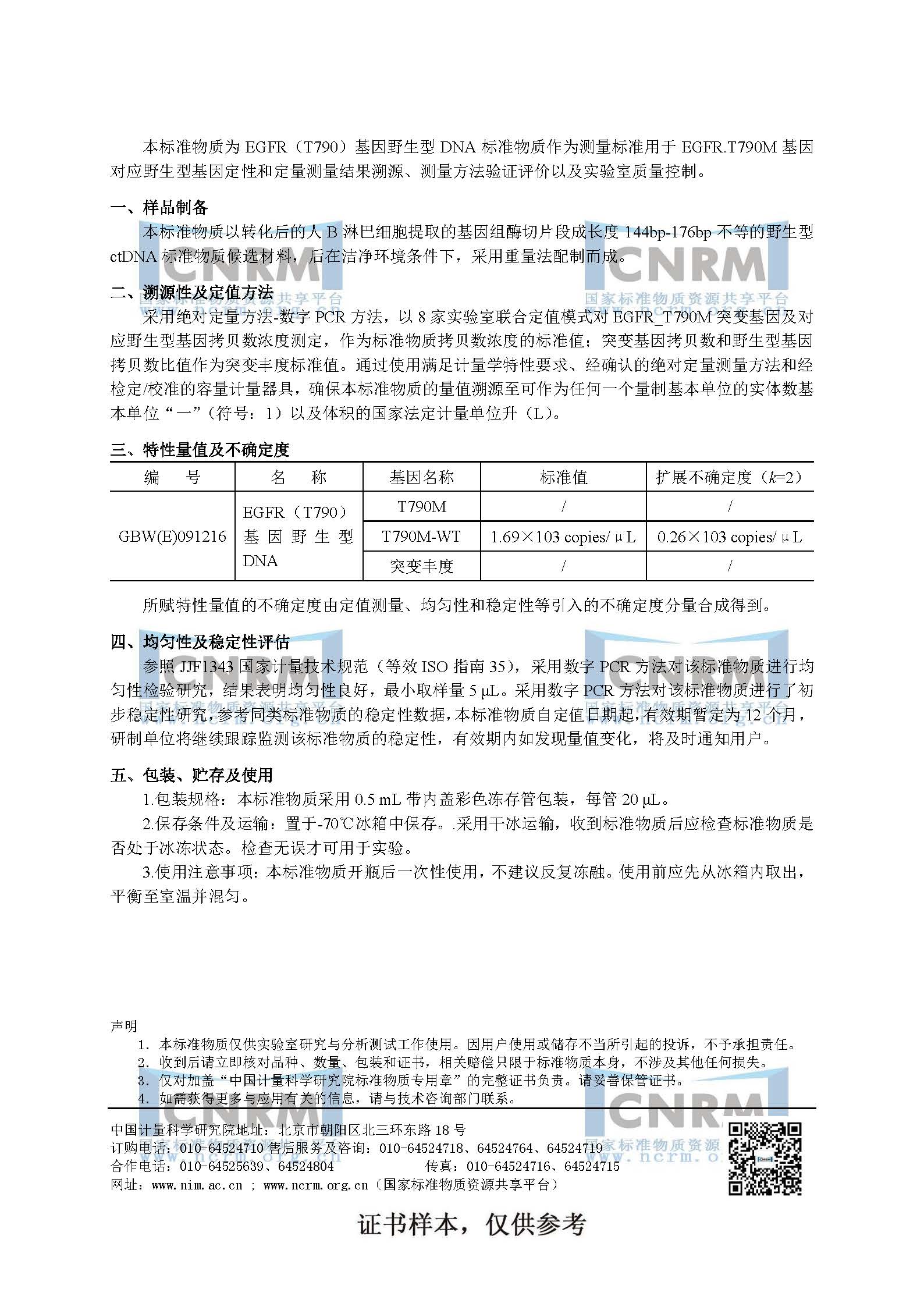 EGFR(T790)基因野生型标准物质GBW(E)091216
