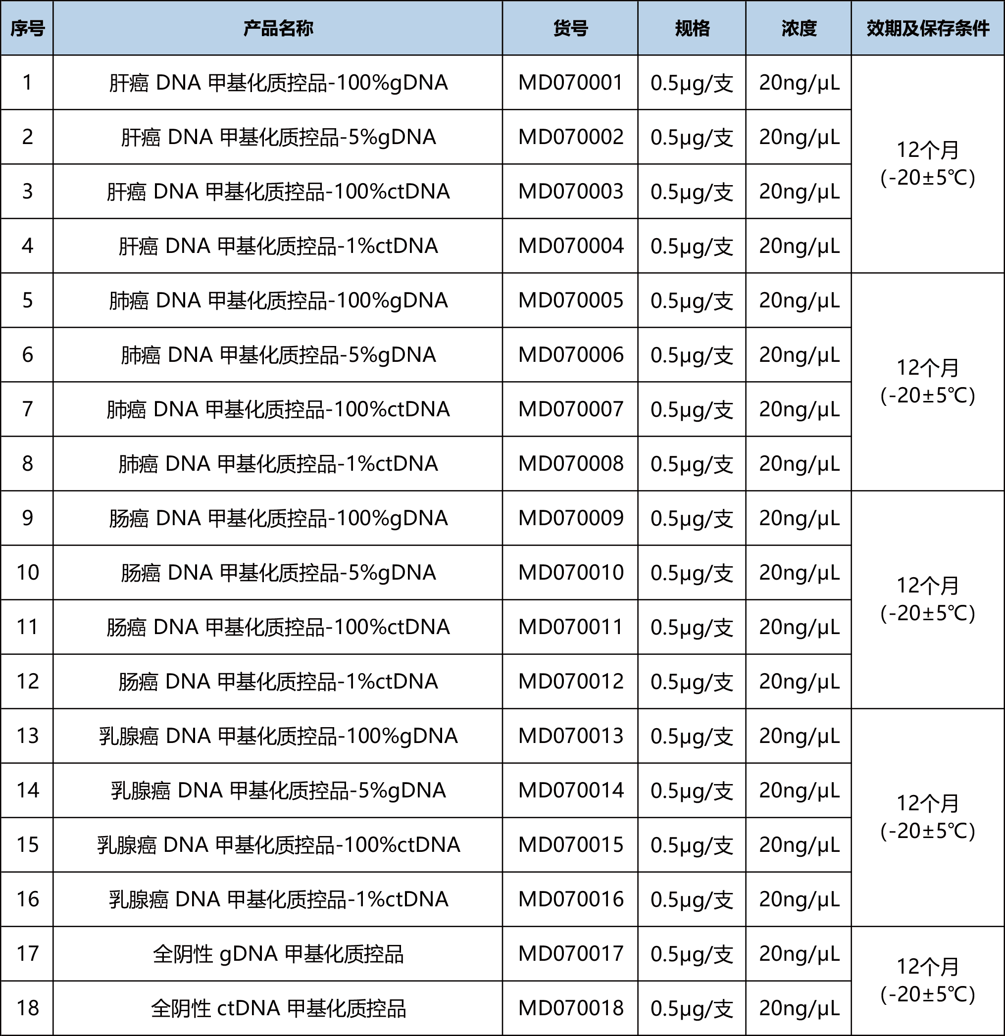 水木济衡针对上述国内临床转化和开展研究较多的癌种,进行DNA甲基化检测质控品的研发于生产,适用于临床血液或粪便样本DNA甲基化检测的室内质量控制。