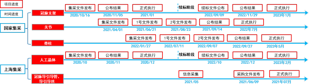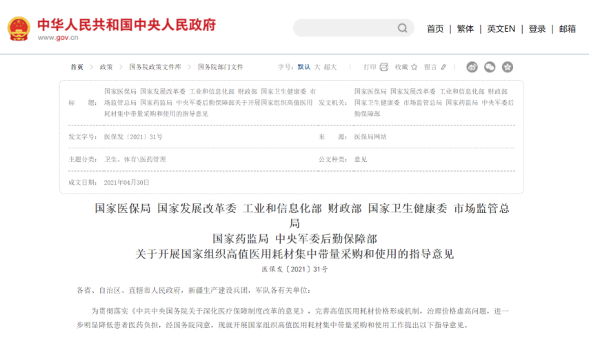 2021年4月30日八局联合发文《关于开展国家组织高值医用耗材集中带量采购和使用的指导意见》,促进高值医用耗材价格回归合理水平,减轻患者负担,更好保障人民群众病有所医;部分临床用量较大、采购金额较高、临床使用较成熟、市场竞争较充分、同质化水平较高的高值医用耗材纳入采购范围。