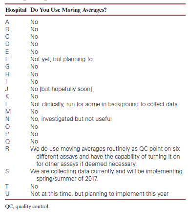 19/21家实验室现在未使用移动均值,1/21家表示科研用过,但未用于临床,1/21家表示在小部分项目使用。有4家实验室考虑未来会使用移动均值,但也有1家表示以前用过,发现没用,从而现在放弃了。