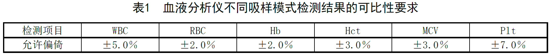 注: 不同吸样模式的结果比对应至少使用10份新鲜血(浓度水平在参考区间范围内),每份标本各检测2次,计算不同模式下各项目检测结果均值与全血吸样模式检测结果均值间的偏倚,偏倚的判定标准见表1,如比对结果的偏倚超出范围,则需调整系数并验证;产品说明书中不同吸样模式检测结果偏倚的要求高于行标时,应道循说明书的要求。