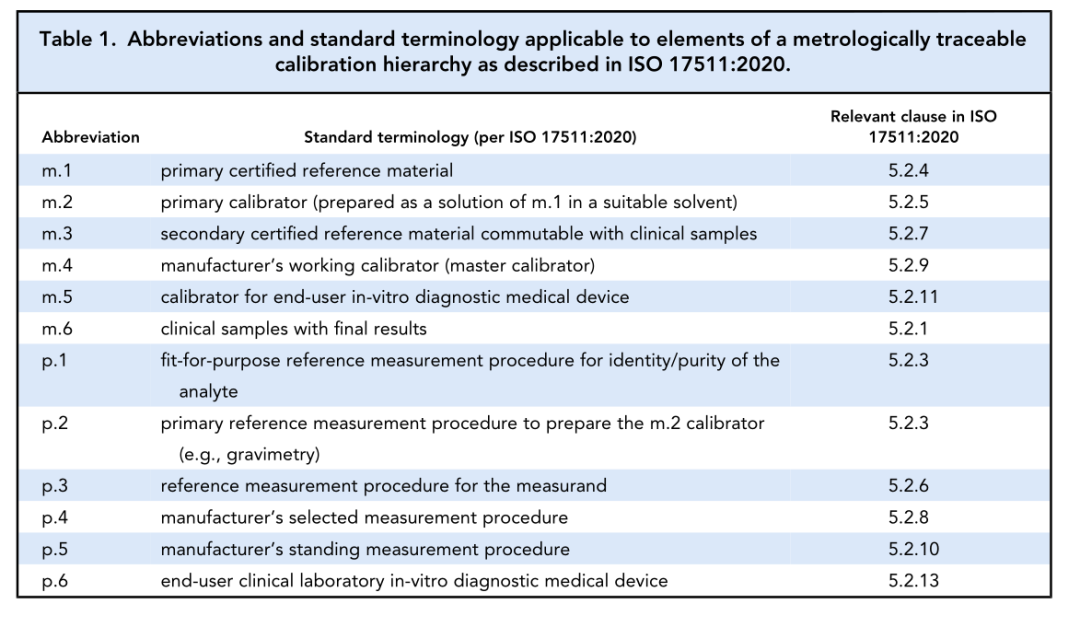 下表给出了ISO 17511:2020中校准层级结构中的各个要素,包括测量程序(p.1到p.6)和参考物质(m.1到m.6)。