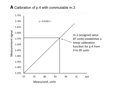 3.3下面C图中,m.4的浓度是83,用p.5制造商常设测量程序测试得出的信号值是1.505。使用m.4和p.5做的校准曲线,其斜率(0.0179)与使用m.3和p.4做的校准曲线的斜率(0.0182)是不一样的,因为p.4和p.5是相同IVD-MD的不同实例。由于p.4和p.5是相同的IVD产品,因此它们受m.4不互换造成的影响程度是一样的。因此,p.5的校准曲线(当用m.4校准时)正确地反映了从可互换的m.3传递到m.4的测量值,并且p.5的线性校准曲线在计量学上可溯源到具有互换性的m.3。