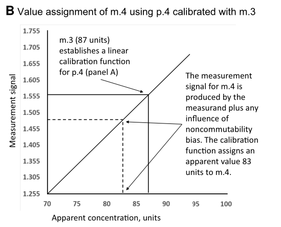 如果m.4不具有互换性,下图B显示在校准等级中,通过增加一步p.4a和m.4a如何将m.4中的不互换造成的偏倚进行纠正 ,具体步骤见这篇文献Miller WG, Budd J, Greenberg N, Weykamp C, Althaus H, Schimmel H, et al. IFCC working group recommendations for correction of bias caused by non-commutability of a certified reference material used in the calibration hierarchy of an end-user measurement procedure. Clin Chem 2020;66:769–78(这篇文献我将在下篇读书笔记中与大家分享)。
