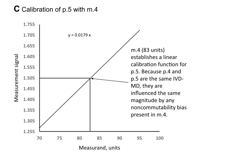 3.4下面D图中, 制造商终端用户产品校准品m.5 ,使用p.5测试得出的信号值是1.474,这个信号值是受测量本身和m.5不互换带来的偏倚的综合影响而得出的。使用m.4和p.5做的校准曲线,给m.5的赋值是81。因为p.4和p.5是相同的IVD-MD,它们在完全相同的程度上受到m.4或m.5中存在的任何不互换造成的偏倚的影响。m.5中任何不互换偏倚的大小都不相关,并且为不互换偏倚校正的被测量值的实际值也不相关。分配给m.5的值将补偿任何与基质相关的不互换偏倚,无论基质与m.4的基质相同还是不同。因为分配给m.4的值将值从可互换的m.3正确地转移到p.5的校准,所以p.5分配给m.5的值正确地补偿了m.5中可能存在的任何不互换偏倚的影响。