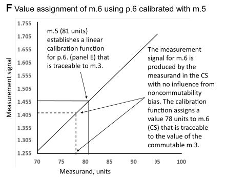 3.6下面F图中,m.6即临床待测样品(CS),使用p.6测试m.6得到其信号值1.410, 通过m.5和p.6建立起来的校准曲线给m.6的浓度是78 units。m.6的测量信号仅由m.6(CS)中的被测量产生,m.6是CS,不受互换性偏倚的影响。因此,分配给m.6(CS)的值可追溯到m.3中的被测量。m.4或m.5中可能存在的任何不互换偏倚,在给m.4或m.5赋值过程中得到补偿。最终临床样品的测量值是78 units。