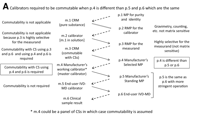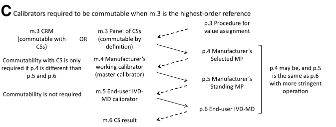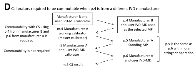 在上面两种情况下,m.4都必须与CS互换,或者前文所述,对添加到校准层次中的不互换造成的偏倚进行校正。因为每个制造商都准备了自己的m.4,不同IVD-MD制造商可能会为m.4提供不同的基质。因此,互换性评估具有挑战性,对于单个IVD-MD制造商来说几乎是不可能的。在这种情况下,可以观察来自不同IVD MD的CS的结果等效性,原则上,可使用IFCC开发的校准有效性方法(见Budd JR, Weykamp C, Rej R, MacKenzie F, Ceriotti F, Greenberg N, et al. IFCC working group recommendations for assessing commutability part 3: using the calibration effectiveness of a reference material. Clin Chem 2018;64:465–74)进行互换性评估。
