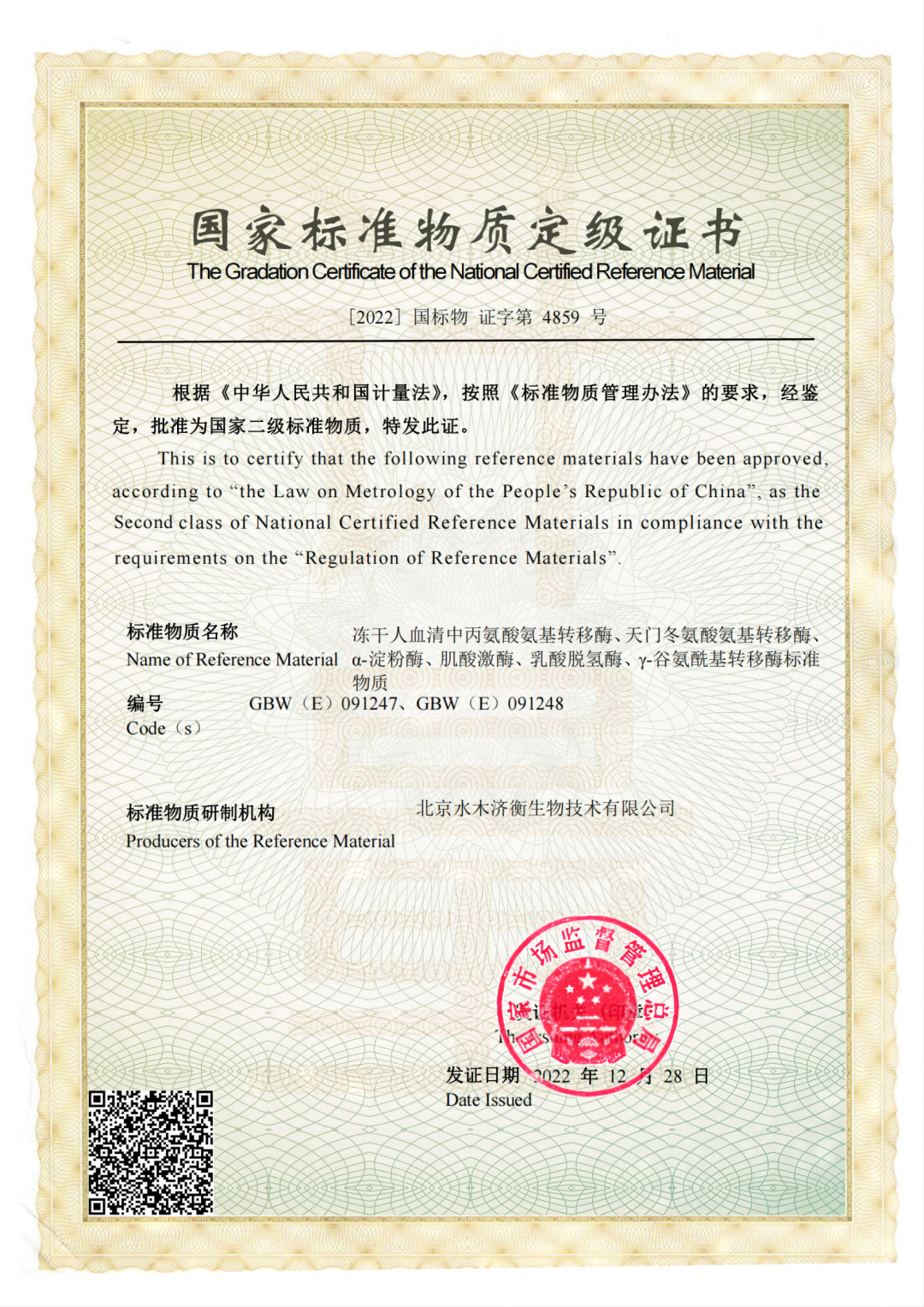 刚刚步入2023年,北京水木济衡生物技术有限公司也迈入新起点、奋进新征程!由公司自主研制的“冻干人血清中丙氨酸氨基转移酶、天门冬氨酸氨基转移酶、α-淀粉酶、肌酸激酶、乳酸脱氢酶、γ-谷氨酰基转移酶标准物质”近日通过国家市场监督管理总局审查,正式获批为国家二级标准物质,编号为GBW(E)091247、GBW(E)091248。标准物质的获批,为新的一年开了个好头。