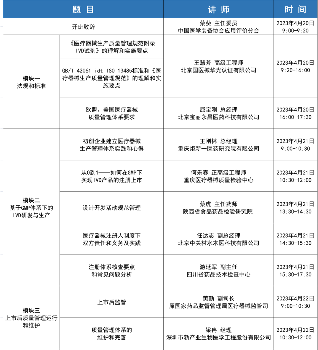 体外诊断试剂研发全流程管理培训课程是分会与北京水木济衡生物技术有限公司共同创办的探索性课程,经2021年一年的筹划,在2022年正式开课,并持续至今,在课程设计上,围绕IVD研发的立项、研发、转化、评价、体系、注册的全过程,识别其中的关键技术和难点要素,设计系列课程,并且在授课师资上也做了精心选择。