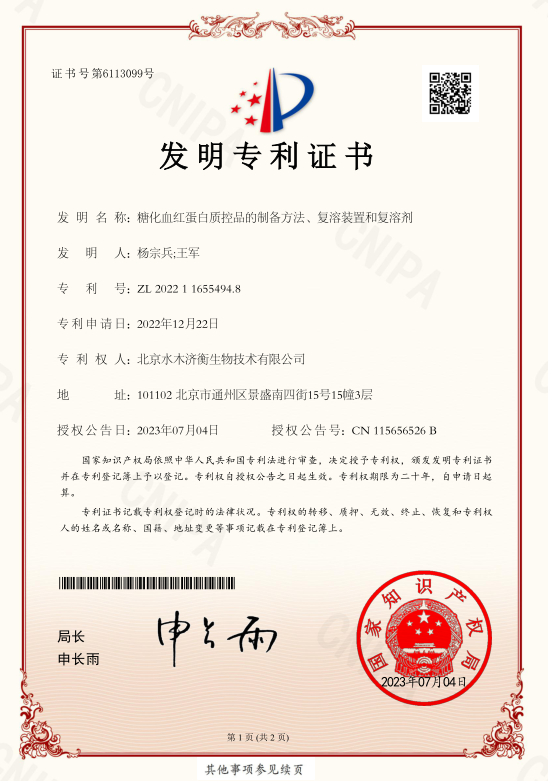 近日,北京水木济衡生物技术有限公司申报的《糖化血红蛋白质控品的制备方法、复溶装置和复溶剂》发明专利获得国家知识产权局授权,取得发明专利证书。