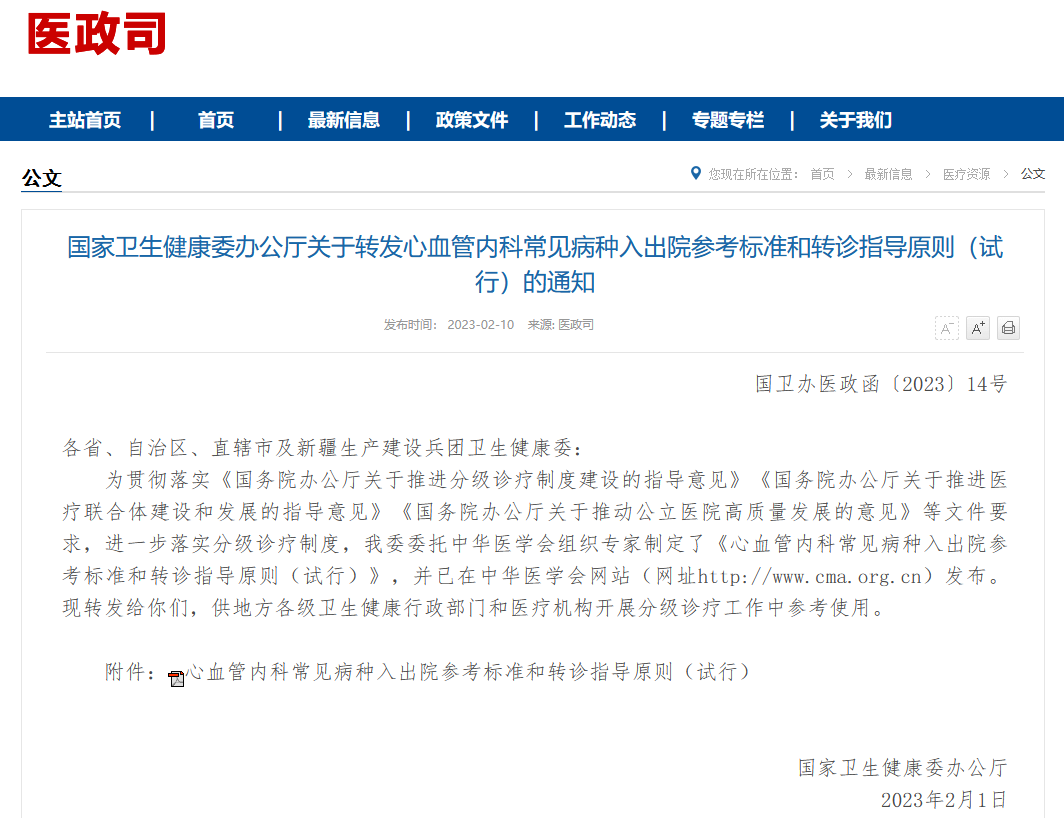 为贯彻国务院办公厅文件要求,中华医学会组织专家制定的《心血管内科常见病种入出院参考标准和转诊指导原则(试行)》文件的发布,给地方各级卫生健康行政部门和医疗机构开展分级诊疗工作中参考使用。