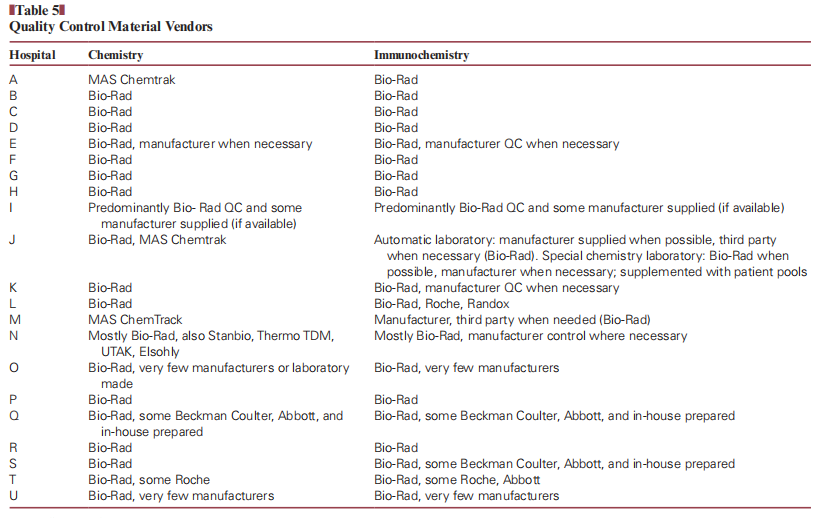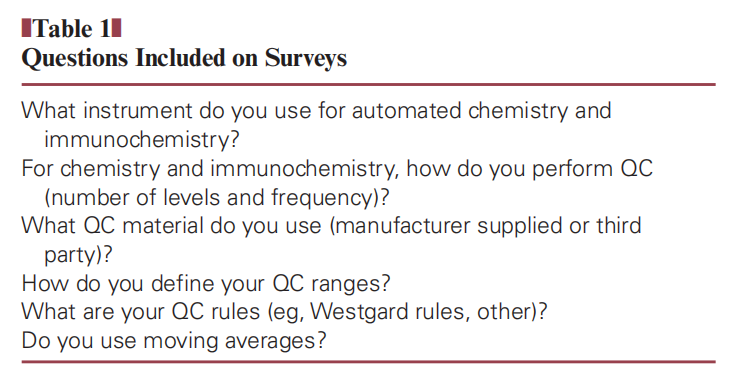 《AM J CLIN PATHOL》杂志2018年第150卷发表了一篇文章《Quality Control Practices for Chemistry and Immunochemistry in a Cohort of 21 Large Academic Medical Centers》。作者希望了解在基于传统L-J图方式的质量控制方法已经实践的几十年当中,是否总结出了最佳的质量控制实践指南。因此调查了美国国内领先的21家学术医疗中心的QC方法,以了解不同医院间的QC实践差别。21家全部回复了调查问卷中的六个问题,具体问题如下: