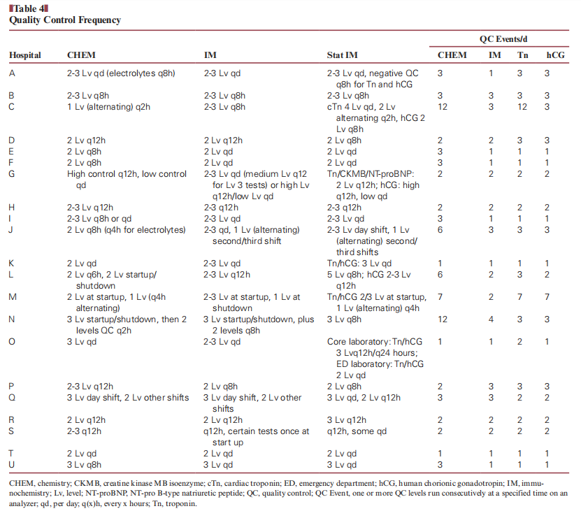 从表4可知,生化项目QC的频率差异很大,从每日运行一次(n=3,14%)到每2小时运行一次(n=2,10%);间隔时间包括每4小时(n=3,14%)、6小时(n=1,5%)、8小时(n=6,29%)和12小时(n=6,29%)。两家(10%)医院的电解质项目与其他生化项目使用不同的QC频率。三家(14%)医院每班只使用一个水平,或者在非日常值班时使用一个交替水平(例如,早上实行高水平,下午实行低水平,夜班实行中水平)。常规免疫和急诊免疫项目(如肌钙蛋白和β-人绒毛膜促性腺激素[hCG])的QC频率和水平也存在差异。不同医院常规免疫项目每天使用的质控水平总数从最少两个到最多三个不等(表4)。对于急诊免疫项目,19个实验室使用2到3个水平,一家医院实验室使用4个水平的肌钙蛋白(包括接近99%百分位的QC),另一家医院实验室使用5个水平的肌钙蛋白,4家医院实验室在不同的时间点交替使用不同水平。与生化一样,一些医院在轮班时使用了单一水平的质控品。