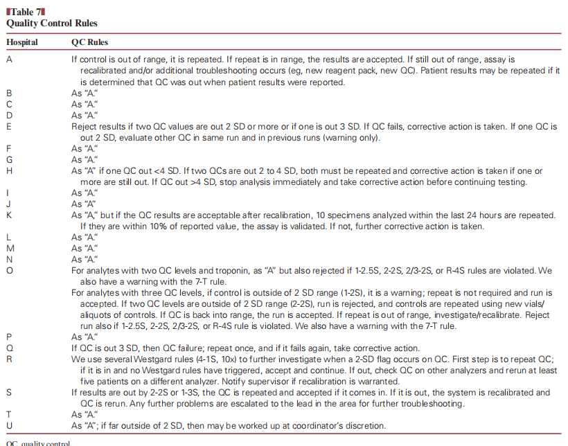 当QC失控时,除一家医院外,所有医院都选择重复检测,如果重复检测在控,接受结果(n=20,95%),尽管一些医院有一些微小的变化(如果一个水平的质控超出4SD,直接拒绝运行;)。有一家(5%)医院如果两个水平的质控超出2SD或一个水平的质控超出3SD,则拒绝运行。另一家医院(5%)如果两个水平质控中有一个水平质控超出2SD,他们会重复检测质控;但如果三个水平质控中只有一个超出2SD,他们就会接受运行。另外,如果违反了以下规则,该医院实验室也会直接拒绝接受:1-2.5S、2-2S、2/3-2S或R-4S。只有实验室E没有规定重复检测质控;如果一个水平超过3SD或两个控制超过2SD,该运行被拒绝为失控。