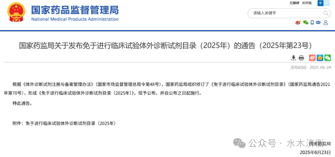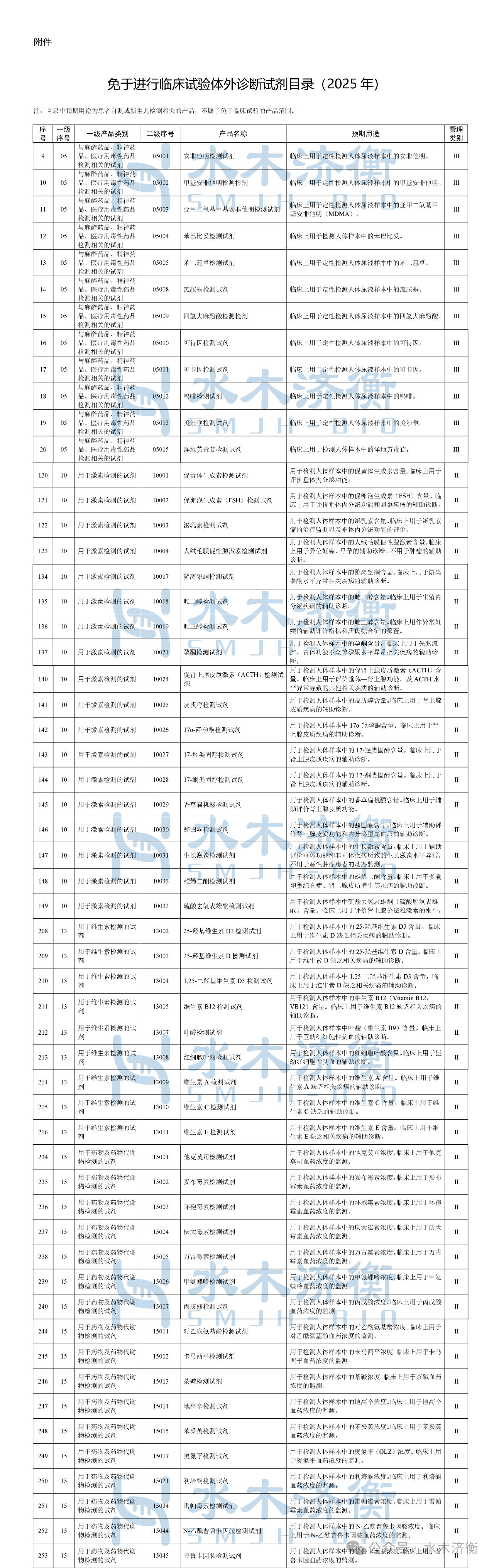 今年6月24日,国家药监局发布《关于发布免于进行临床试验体外诊断试剂目录(2025 年)的通告(2025 年第 23 号)》,其中涉及多项质谱相关检测试剂,包括:维生素,治疗药物、激素、微量元素等相关的试剂。(见附件1目录截图)