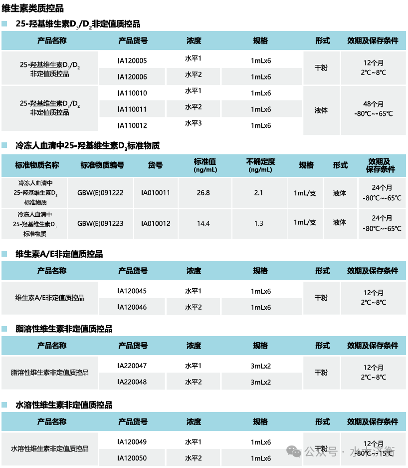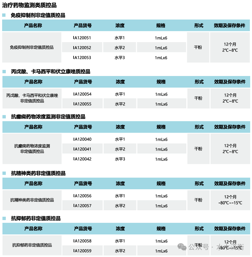 该目录的发布,不仅规范了体外诊断试剂注册管理,更通过优化审评审批流程,打破临床试验投入高、周期长的困局,加速成熟技术产品上市,为临床诊断带来更多高效、经济的工具,也为相关企业研发指明方向,推动整个体外诊断行业的发展。为了行业的规范化发展,更应重视相关检测的质量控制,其中质谱检测的质量控制仍处于初步发展阶段,其相关质控品的发展、技术革新需要更多的研究机构、企业单位参与。水木济衡作为全品类的第三方质控品制造商不但可以提供常规生化免疫检测用质控品、分子检测用质控品外,还可以提供多种质谱检测质控品。质控品包含的分析物覆盖维生素、激素、治疗药物、微量元素检测等常规质谱检测项目。(见附件2目录截图)