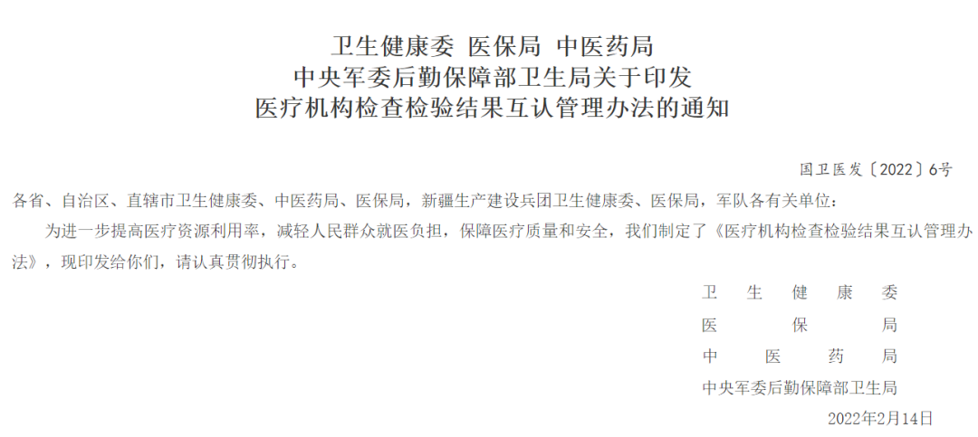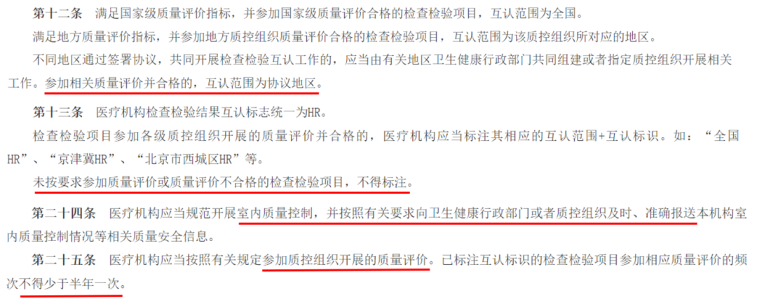 2022年国家卫健委联合医保局、中医药局及军委后勤保障部卫生局即联合发布医疗机构检查检验结果互认管理办法通知,其中对互认检查检验项目的质量控制提出相关要求:要求相关项目的质量评价必须合格,如不合格不得标注结果互认标志;要求互认项目的室内质控结果要定期上传到组织结果互认的卫生健康行政部门或质量控制组织;要参与相关质控组织开展的室间质评相关活动,且频次不得少于半年一次。