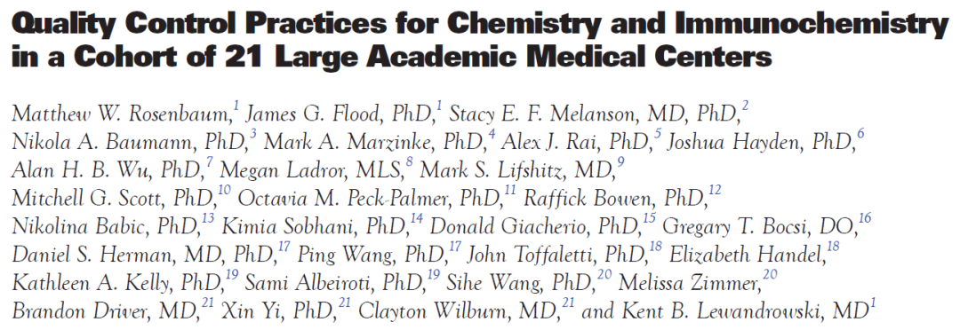 《美国临床病理学杂志》(AM J CLIN PATHOL)2018年第150卷刊登了一篇文章《Quality Control Practices for Chemistry and Immunochemistry in a Cohort of 21 Large Academic Medical Centers》。