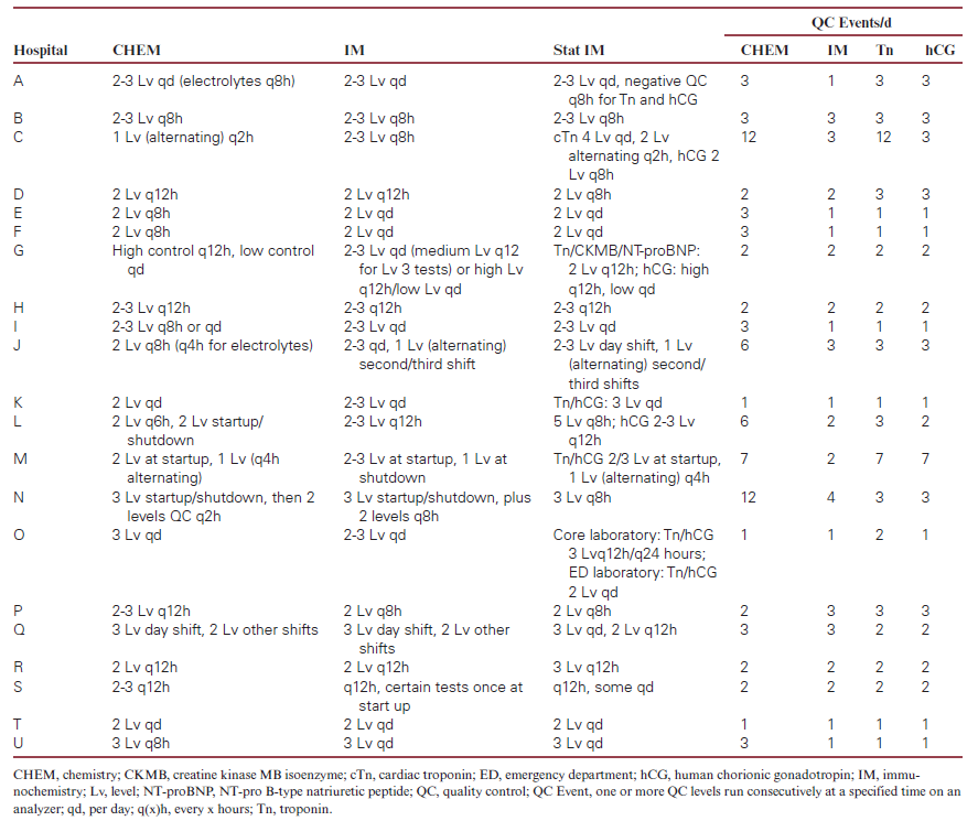 研究者调查了美国21家领先的大型学术医学中心的临床实验室,其目的是评估各实验室是否有标准化的室内质控方案。