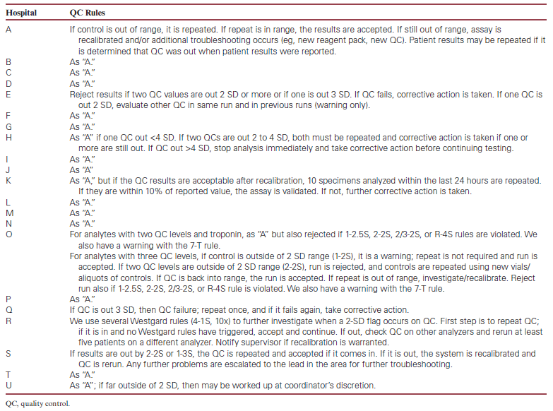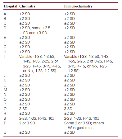 在接受调查的21家医院中,只有两家明确使用Westgard规则。Westgard规则是由James Westgard和他的同事在20世纪70年代提出的,他们试图用数学上严谨的方法将质量控制系统化。Westgard规则用于评估QC数据,旨在提供一个合适的方法来提高误差检出概率并降低假失控概率。