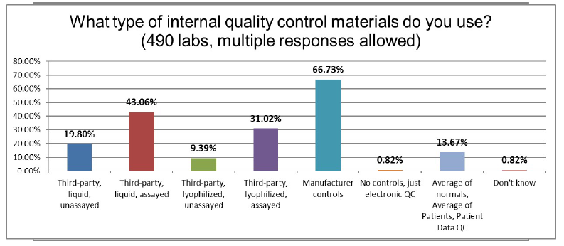 75.99%的实验室报告说,当失控时他们试图排除故障并寻找原因。但几乎同样多的实验室(68.06%)报告说,他们只是重复测试质控。55.53%的实验室还会再运行一个新的质控品。当新的质控品还“失控”的话,仍然有16.08%的实验室会再重复测试这个新的质控品。甚至有3.76%的实验室多次重复测试质控品。