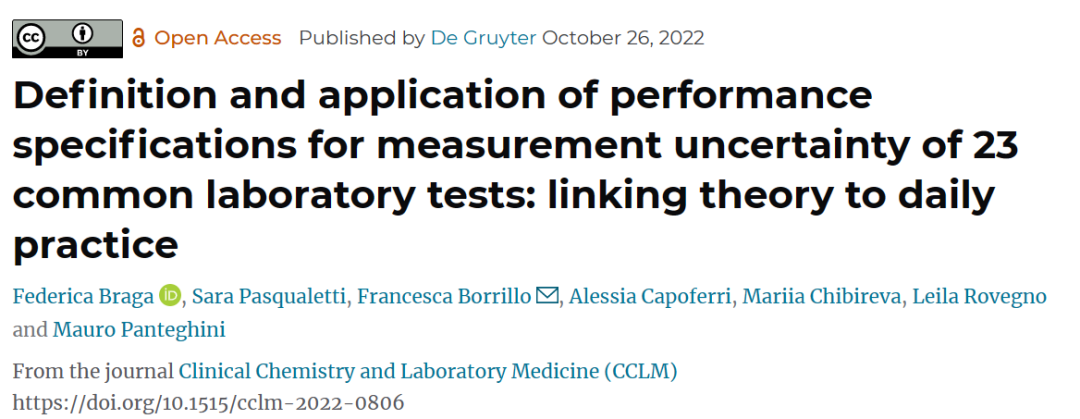因此医学实验室如何应用“测量不确定度”一直是大家比较关注的话题,最近《Journal of Clinical Research in Pediatric Endocrinology》杂志(European Federation of Clinical Chemistry and Laboratory Medicine(EFLM)官方学术期刊)发表了一篇关于测量不确定度的实践应用文章——《Definition and application of performance specifications for measurement uncertainty of 23 common laboratory tests: linking theory to daily practice》,作者来自米兰大学检验医学计量溯源性中心。