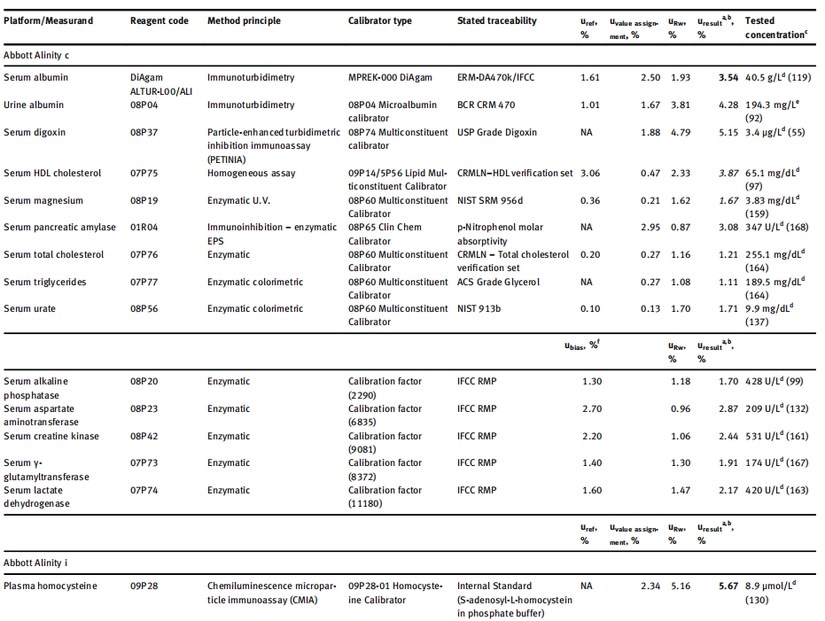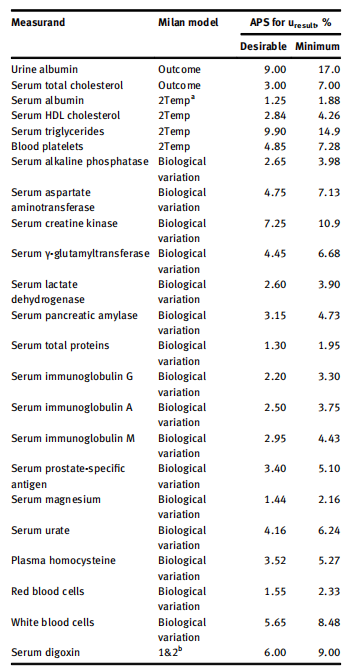作者主要是依据2014年EFLM米兰共识会议上定义的三个模型,对23个常见检测项目按照适用的不同模式依据适合的分析性能质量指标推导计算了各项目的测量不确定度,作者评估了在其实验室中商品化检测系统是否可以满足各项目的分析性能质量指标要求。大多数检测项目(血清碱性磷酸酶、天冬氨酸氨基转移酶、肌酸激酶、γ-谷氨酰转移酶、乳酸脱氢酶、胰腺淀粉酶、总蛋白、免疫球蛋白G、A、M、镁、尿酸盐和前列腺特异性抗原、血浆同型半胱氨酸和血红细胞和白细胞)按照基于被测量生物学变异(BV)组分模型计算,并且确定了相应的分析性能质量指标(分别是2.65%、4.75%6、7.25%6、4. 45%、2.60%、3.15%、1.30%、2.20%、2.50%、2.95%、1.44%、4.16%、3.40%、3.52%、1.55%和5.65%)。血清总胆固醇和尿白蛋白按照基于分析性能对临床决策的影响模式计算,相应的分析性能质量指标分别是3%和9%。由于缺少基于结果的信息,血清白蛋白、高密度脂蛋白胆固醇、甘油三酯和血小板被暂时重新分配到基于被测量生物学变异(BV)模型,相应的分析性能质量指标分别为1.25%、2.84%、9.90%和4.85%。血清地高辛采用前两种模型混合的方式计算,相应的分析性能质量指标为6.00%。在日常实践中,通过使用作者实验室的检测系统,16个检测项目符合适当的分析性能质量指标要求,5项满足最低分析性能质量指标要求,而两项(血清白蛋白和血浆同型半胱氨酸)超出了分析性能质量指标要求,需要改进。