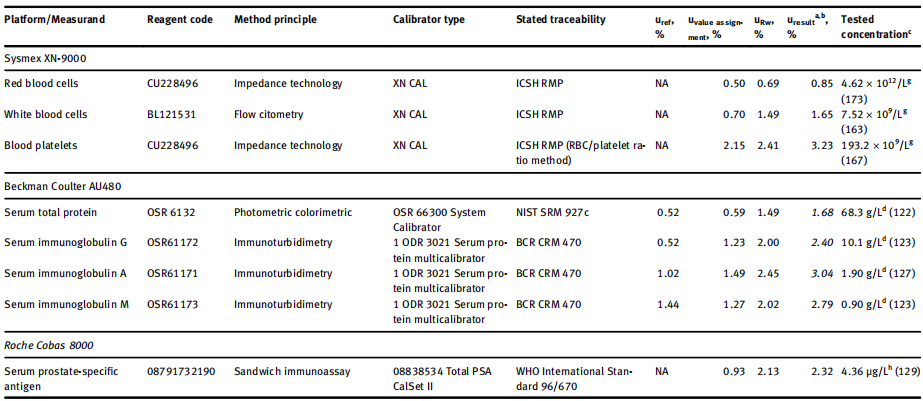 ISO 20914:2019为医学实验室提供了根据选择的溯源链上各相关来源的测量不确定度,采用自上而下的方法评估被测量的量的测量不确定度的指导。作者通过实践应用2014年米兰会议确定的依据三种模式确定分析性能质量指标的方法,评估了23个常用检测项目,并获得了较理想的结果,同时也对其他医学实验室评估检测项目的测量不确定度有借鉴作用。作者主要是依据2014年EFLM米兰共识会议上定义的三个模型,对23个常见检测项目按照适用的不同模式依据适合的分析性能质量指标推导计算了各项目的测量不确定度,作者评估了在其实验室中商品化检测系统是否可以满足各项目的分析性能质量指标要求。大多数检测项目(血清碱性磷酸酶、天冬氨酸氨基转移酶、肌酸激酶、γ-谷氨酰转移酶、乳酸脱氢酶、胰腺淀粉酶、总蛋白、免疫球蛋白G、A、M、镁、尿酸盐和前列腺特异性抗原、血浆同型半胱氨酸和血红细胞和白细胞)按照基于被测量生物学变异(BV)组分模型计算,并且确定了相应的分析性能质量指标(分别是2.65%、4.75%6、7.25%6、4. 45%、2.60%、3.15%、1.30%、2.20%、2.50%、2.95%、1.44%、4.16%、3.40%、3.52%、1.55%和5.65%)。血清总胆固醇和尿白蛋白按照基于分析性能对临床决策的影响模式计算,相应的分析性能质量指标分别是3%和9%。由于缺少基于结果的信息,血清白蛋白、高密度脂蛋白胆固醇、甘油三酯和血小板被暂时重新分配到基于被测量生物学变异(BV)模型,相应的分析性能质量指标分别为1.25%、2.84%、9.90%和4.85%。血清地高辛采用前两种模型混合的方式计算,相应的分析性能质量指标为6.00%。在日常实践中,通过使用作者实验室的检测系统,16个检测项目符合适当的分析性能质量指标要求,5项满足最低分析性能质量指标要求,而两项(血清白蛋白和血浆同型半胱氨酸)超出了分析性能质量指标要求,需要改进。
