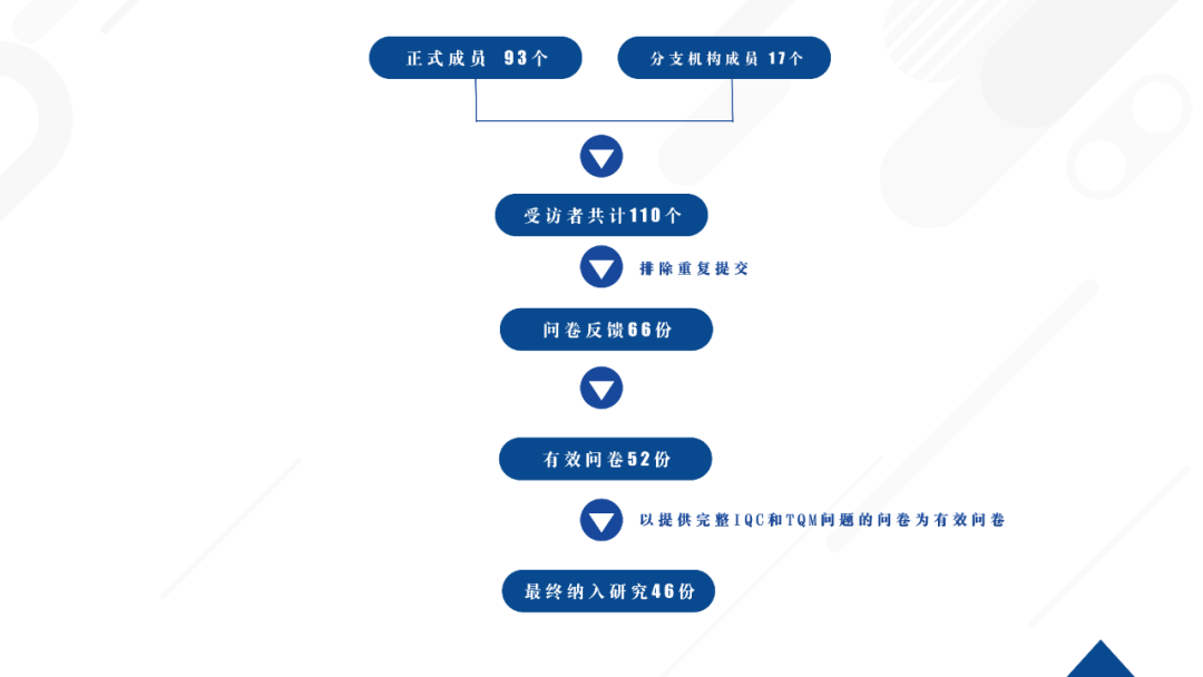 调研以问卷的形式开展,涵盖了共计16个有关于IQC和TQM的问题,110家收到调查问卷的成员机构中收到46份有效回复,通过这46份问卷,得到以下结论: