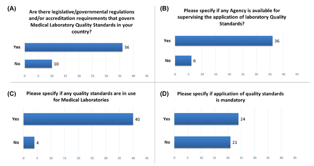 ---78.3%(n=36)的国家对于医学实验室质量管理有明确的立法规定或者认可要求,但在46.7%(n=21)的国家并非强制执行;