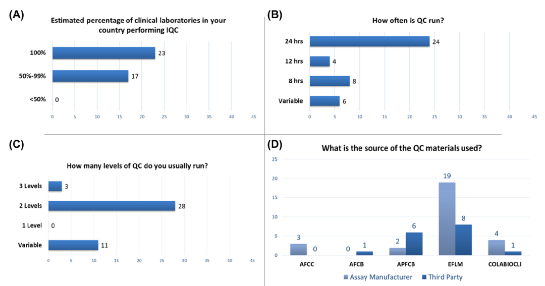 ( A )表示一个国家内进行IQC的实验室的百分比( n = 40 )。( B )表示受访者所在国家QC的运行频率( n = 42 )。( C )表示各国使用QC水平的数量( n = 42 )。( D )表示各国使用QC材料的来源( n = 42 )