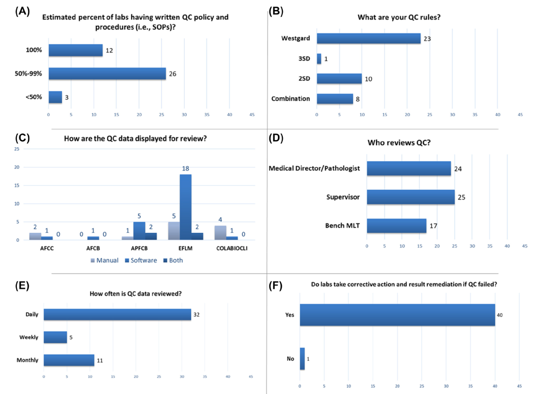 ( A )一个国家的实验室是否有IQC的书面政策和程序( n = 41 );( B )被调查者所在国家使用的IQC规则( n = 42 )。( C )各国显示QC数据的方法( n = 42 );( D )在参与国家( n = 40 )中谁对QC进行了评价。( E )各国对QC的审查频率( n = 42 )。( F )如果QC不可接受( n = 41 ),是否采取纠正措施。