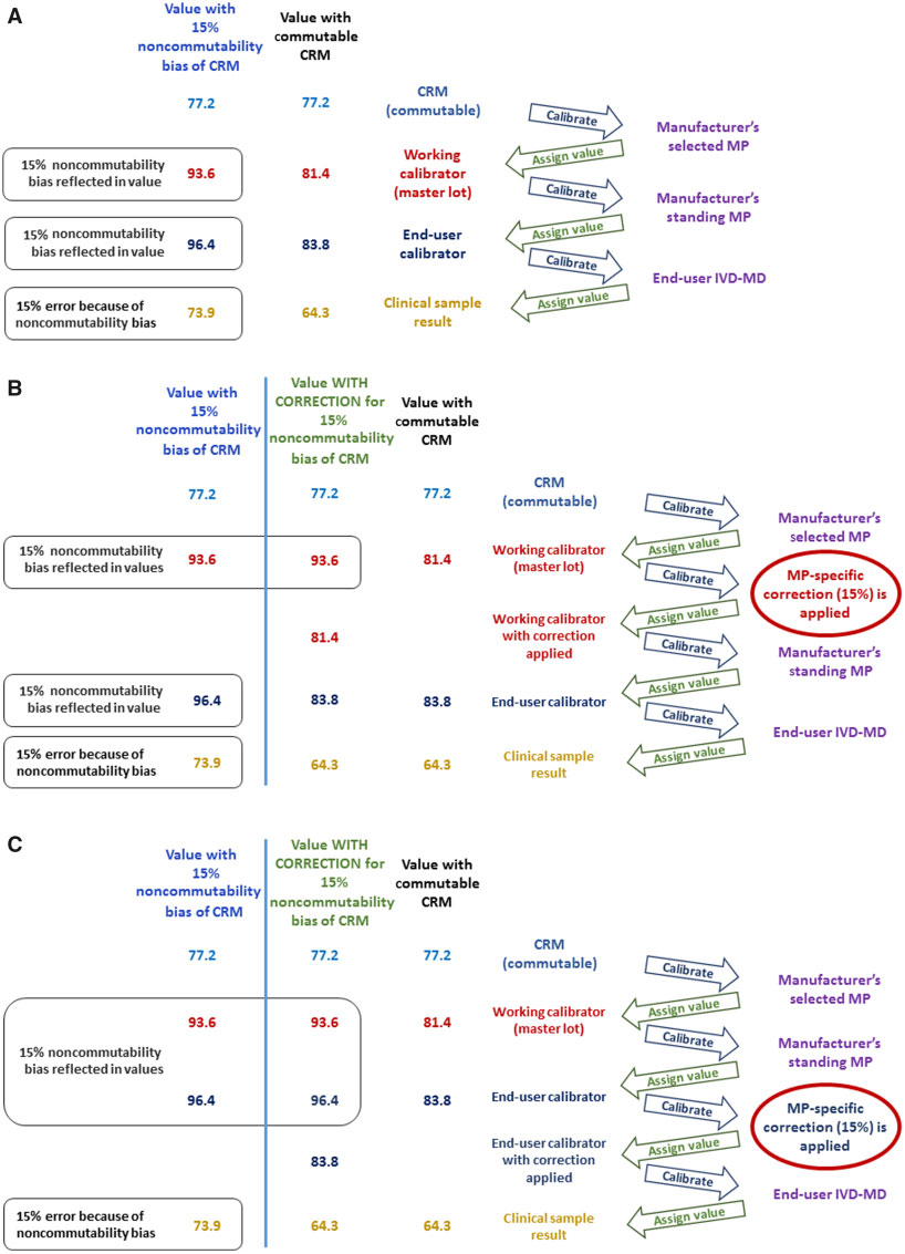 MP制造商(包括LDT实验室)负责对CRM互换性造成的偏倚进行纠正。当在校准层级结构中纳入对CRM的不可互换造成的偏倚进行适当校正时,制造商可以通过对校正步骤的充分披露和描述来声称对CRM的值的可溯源性。